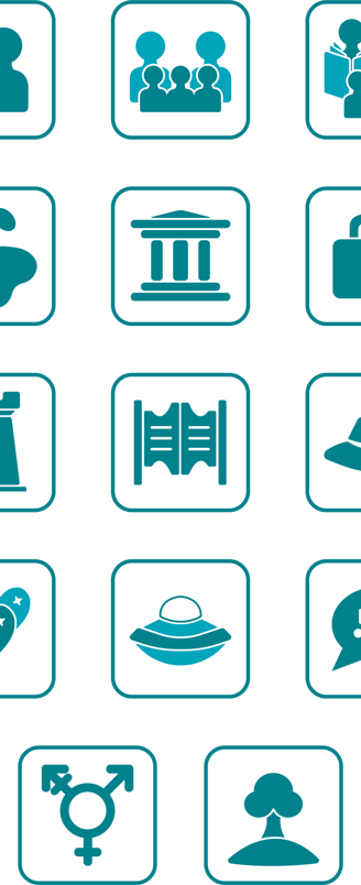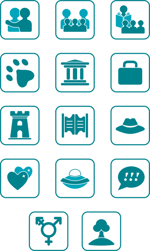 Iconen voor de genres van boeken in bibliotheken. Gemaakt in Adobe Illustrator, voor een schoolopdracht.
